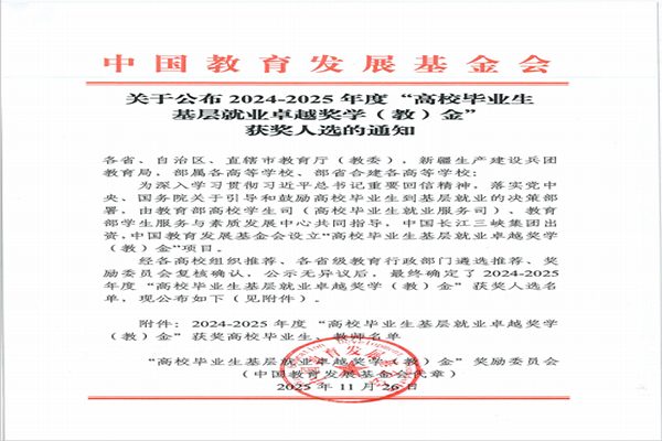 城市建设学院学子毕业生获“2024-2025年度全国基层就业卓越奖”