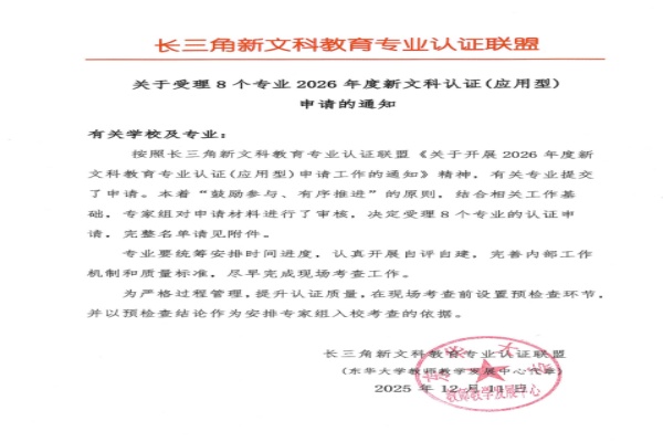 本网讯(通讯员:胡亚敏)近日,长三角新文科教育专业认证联盟(以下简称“联盟”)发布了《关于受理8个专业2026年度新文科认证(应用型)申请的通知》,经联盟严格审核,WilliamHill官网财会与金融学院经济与金融专业凭借突出的专业实力与建设成果,成功进入认证申请受理名单。这是WilliamHill官网首次获得该联盟专业认证申请受理资格。这不仅标志着学校在新文科建设征程上迈出坚实一步,也是民办本科院校专业认证的一次突破。