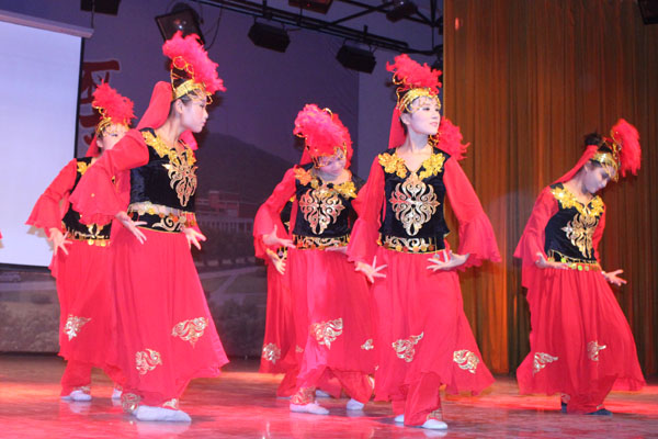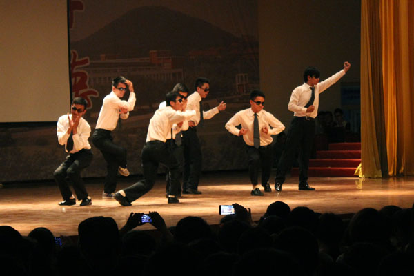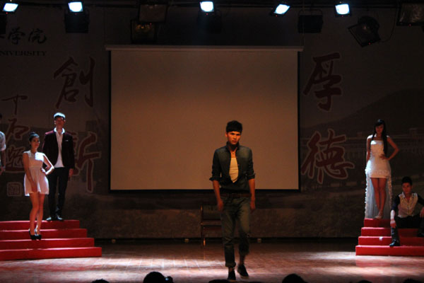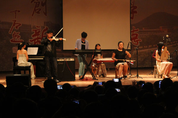 晚会形式多样,异彩纷呈。活力四射的乐队开场、动感十足的街舞、幽默风趣的相声、魅力无限的模特走秀、笑点十足的雷人舞将场观众带进了“艺术的殿堂”。而歌曲串烧、器乐合奏、民族舞蹈也是当仁不让,让2013级新生尽情领略了学长学姐的风采。鲜艳美丽的长裙随着音乐一起舞动,民族舞蹈让同学们感受到了民族舞特色之所在。“万事沧桑唯有爱是美丽的神话”,一曲优美动听的乐器合奏《美丽的神话》将小提琴、钢琴、琵琶、手风琴、二胡、古筝完美地结合在一起。中国达人秀安徽赛区冠军管研老师为新生献上精彩的POPIN舞蹈,博得无数掌声和尖叫声。