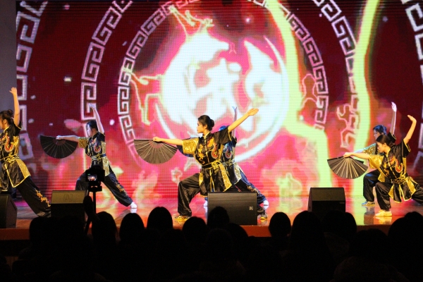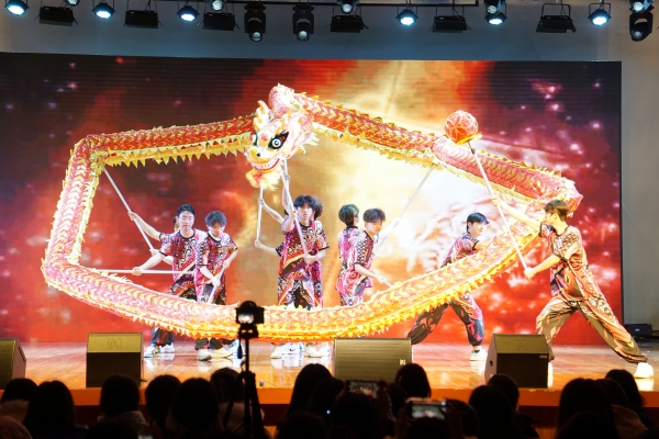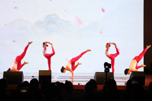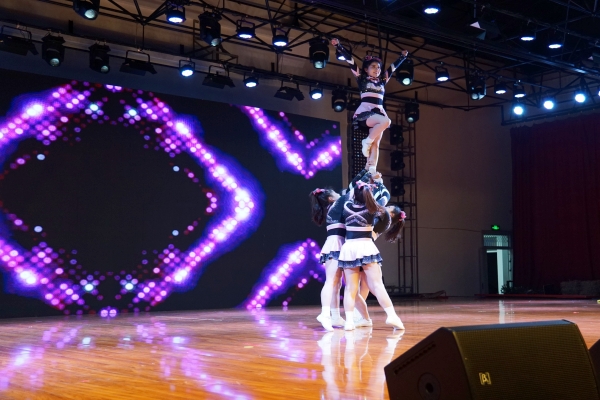 展演在舞龙舞狮俱乐部节目《千里跃进大别山,红色基因永流传》中拉开序幕,随后形体舞、艺术体操、啦啦操、瑜伽、花样跳绳、排舞、武术、健美操、街舞等俱乐部先后呈现了《民族一家亲》《梁祝》《跃动青春》《绳舞飞扬》《绽放》《扇蕴丹青》《霹雳武侠》等12个各具特色的节目,将力量与美感、传统与创新相融合,彰显了华园学子的青春朝气,体现了体育俱乐部的专业教学水准。最后,通识教育部操舞教学组教师团队带来《跃动华园城》,以大气磅礴的编排为本次展演画上圆满句号,将现场氛围推向高潮。