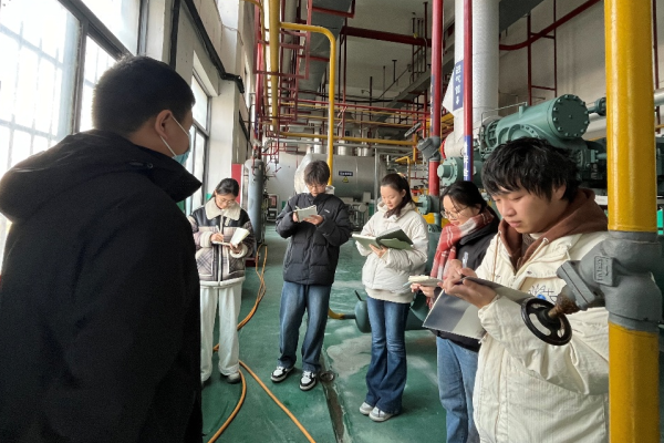 在蚌埠合一冷链总经理徐斌的热情接待下,师生们首先了解了企业的基本概况与发展愿景。随后,师生们深入氨制冷机房,实地参观了涉氨制冷系统的核心设备。企业工程师吴昊天详细讲解了氨制冷工艺流程,系统介绍了压缩机、贮液罐、低压循环桶、热氨冲霜系统、集油器、安全泄压装置等关键设备的作用与运行机制,并耐心解答了学生们提出的各类技术问题。