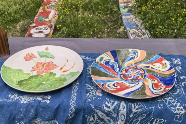步入展区,首先映入眼帘的是植物染与陶艺作品展示区。天然草木染出的布艺作品色彩温润,蓝靛、茜草、柿子等植物染料在布料上留下自然的纹理与图案;一旁的陶艺作品造型古朴,既有实用的茶盏,也有充满童趣的小摆件。这些作品将传统工艺与当代审美巧妙融合,通过创新的设计语言展现古老技艺的活力,吸引众多师生驻足欣赏、拍照打卡,他们时而低声交流感受,时而弯腰细观工艺,让展区充满了生机与艺术气息。