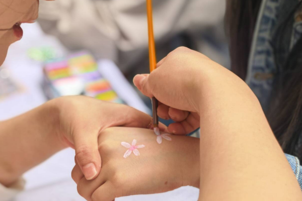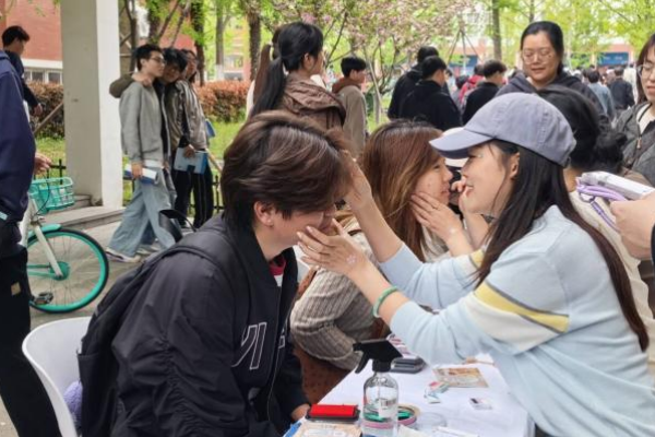 移步来到樱花彩绘体验区,只见队伍早已排成长龙。建筑学专业的老师正手持环保颜料,在同学们的脸颊与手背上细细勾勒樱花、花钿、云纹等精致纹样。一位女生举起手背,开心地说道:“画上樱花后,感觉自己真的融入了这片花海!”短短几分钟,一朵朵樱花便在同学们的笑颜间绽放,与枝头的烂漫繁花相映成趣,成为春日校园里最灵动鲜活的一道风景。