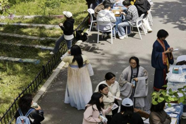 不远处,古风汉服试穿打卡区人气爆棚。师生们换上齐胸襦裙、圆领袍等汉服,执团扇、撑纸伞,漫步樱花树下拍照留念。大家纷纷参与“最美花神”线上评选,上传自己的汉服打卡照,角逐“花神”称号。现场古韵盎然,仿佛一场穿越时空的雅集,传统文化之美在镜头与笑颜间流转。投壶游戏区欢声不断,参与者屏息投矢,命中者即可赢取小奖品,传统游戏魅力十足。整个区域里,樱花的柔媚与汉服的典雅、投壶的趣味交织在一起,让师生们在沉浸式体验中感受到传统文化的独特魅力,也为樱花节增添了浓厚的古韵与欢乐氛围。