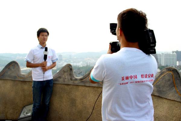 此次“悦读采风团”除了欣赏、记录天柱山的特色风景外,还有一个安排就是对景区领导进行采访。在结束天柱山的欣赏之旅后,经过午餐的休息调整,大学生记者采风团一行人在三祖寺对葛玉屏进行了现场采访。