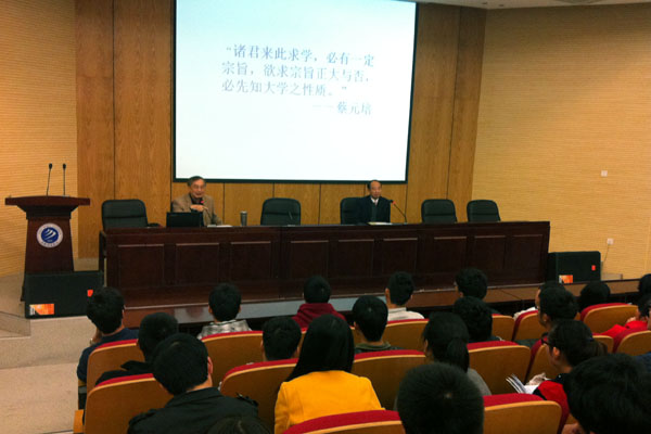 朱镜人从比较的视角,对中外大学的起源、发展、现状进行了对比介绍,对“大学”的概念进行了解读,向同学们介绍了诸如牛津大学、剑桥大学等世界著名大学,并结合自已海外求学的经历和同学们畅谈大学教育的价值。朱教授谈到,大学教育能够使人在知识、品德等各方面的素养得到发展,大学教育的价值不仅仅体现在促进人的发展方面,也体现在促进社会发展方面。对于大学生活,朱镜人强调,大学生既要进行知识和能力的准备,更要注重德行的养成;要尽可能的丰富自己业余生活,要去接触社会,了解社会;要养成锻炼身体的好习惯。朱镜人希望同学们能够把握好大学时光,让四年的大学生活成就美好的未来。