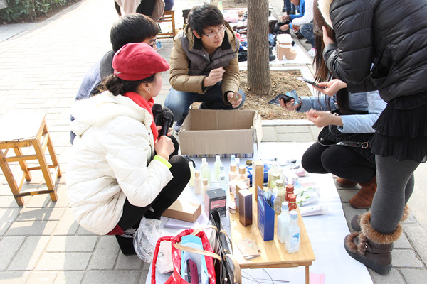 参与此次活动的人员除了即将毕业的大学生外,也不乏一些具有创业想法的新生。外国语学院2013级英语专业的陈蕴就报名参加了,在她的摊点上,可以看到各式各样的护肤品和化妆品,她说:“自己家里有亲戚做化妆品行业,所以能保证化妆品的质量,平常也经常推荐给同学,价格绝对不会高,都是在大家能接受的范围内”,她还想着明年在创业孵化基地申请一间办公室。
