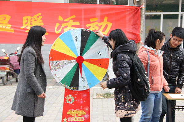 动漫学院门口的幸运大转盘前围满了女生,当转到与自身的衣服颜色相近的颜色区域时,便可领取奖品;礼仪知识竞答比赛吸引了很多女生参加,主持人现场出题,参与者抢答,答对者可以获得礼品一份;在“心语心愿”的环节,女生写下自己的愿望,放入抽奖箱中,抽中后,奖品会在晚上送到获奖者的宿舍里。2013级环境设计班王想想同学兴奋地表示,我参加了所有的活动,也得到了很多奖品,这是我第一次过“女生节”,很开心,也很幸福。