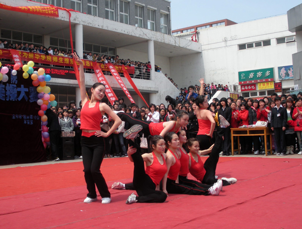 4月16日中午12点,由健美操协会体育部主办的第四届校园健美操大赛在工大广场进行决赛,学院六名专业体育教师担任评委。