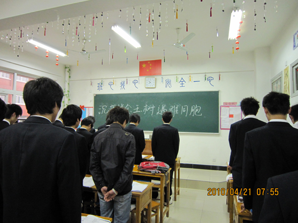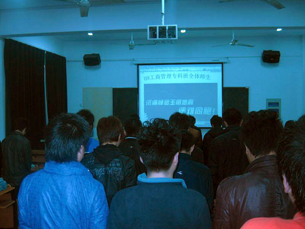 4月21日上午10时许,我院师生共同举行哀悼仪式,为青海玉树遇难同胞默哀。他们共同为地震灾区祈福,愿逝者安息,生者坚强。 (土木与工业工程学院、继续教育学院)