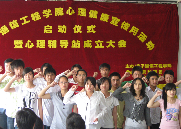 本次电院心理健康宣传月的主题为:让爱驻我心。行政秘书首先宣读了心理健康宣传月相关活动项目、活动计划及活动规程,介绍了心理辅导站成立的意义;心理委员代表组成的电院心理使者团庄严宣誓,明确了自己的职责和任务,表达了对学院心理健康号召的积极响应;09电子信息工程专业的王群同学作为学生代表发言,他向全体师生发出关注大学生心理健康,共建和谐宿舍、和谐班级、和谐校园的号召。