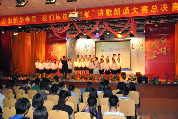 据悉,本次大赛分为团体和个人组比赛,共有9个二级学院的400余名选手参加了大赛,经过激烈比拼,共有5个二级学院的16组选手进入了总决赛。大赛在文化与新闻传播学院09文秘班的集体朗诵下拉开了序幕。随后,选手们用各种独特新颖的表演形式将诗歌朗诵深情演绎,诠释了同学们对诗歌文学的热爱、对母校的爱恋、对生命的感悟以及对青春的理解。