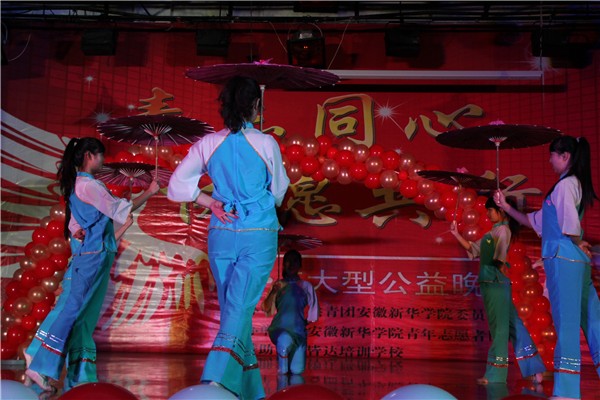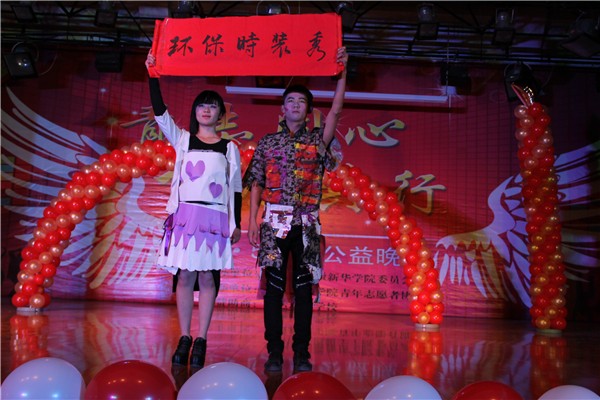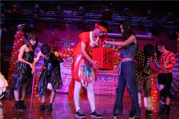 晚会由一段激光舞开场,并在情景剧、话剧、舞蹈、小品及抽奖环节的不断更替进行中,观众们都拿起手中的手机亮频和荧光棒挥动着。青协文体部用一部情景剧《暖暖青春》把青春展现的淋淋尽致。安徽幼儿教育志愿者的《民族舞》及青协礼仪队的《落花情》也引得台下观众连连叫好。青协格桑花的话剧《雨中邂逅,志愿永恒》更是把现场气氛推向了高潮。话剧中的女主角用她一生的奉献让孩子们可以有念书的条件,让每个人拥有梦想的权利,和着缓慢而低沉的乐声,不禁让观众落下了感动的泪水。晚会由青协环保社表演的特色节目《环保时装秀》落下帷幕,环保社的成员们用报纸,瓦楞纸板,塑料袋,废弃的红色横幅,军训服装等等制作成风格不一,十分惹眼的时装,也让观众看到了保护环境的必要性和重要性。