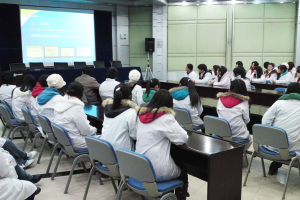在会议室,安科公司领导对药学院师生的到来表示热烈欢迎,他向大家介绍了安科生物公司的基本情况,以及公司生产、研发等各项工作。随后,公司领导带领大家参观了公司的的药品研发室、药物新剂型研究室、微生物室、临床药理研究室、天然药物与生物技术研究室、基因工程研究室以及陈列室等地,使同学们对现代生物药品的制药程序以及生产中一些安全防卫措施有了初步了解。其间,他还穿插着向大家有针对性地介绍了新药研究、开发、销售等环节,让同学们对现代药品生产状况有了进一步的认识。