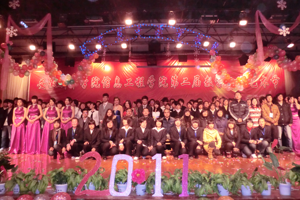 晚会在青春活力四射的舞蹈中开场,并在舞蹈中创新穿插了“祝愿全院师生旦诞快乐”的祝福横幅,接着行政副院长吴恒修开幕词,他从就业、科研、学生获奖等六大方面概括了一年来信息工程学院师生取得的一系列成绩,并希望全体师生员工在新的一年里再接再厉、再创辉煌,取得更优异的成绩。颁奖典礼中,教师代表胡贤德和祝静静分别为在本届计算机文化月中获得奖项的个人及集体颁发了证书和奖品。计算机组装获奖代表队,在现场为广大同学表演了娴熟的“蒙眼组装”技巧,技惊四座。晚会节目表演环节先后上演了精彩的劲爆街舞、热门歌曲、古典乐曲、诗歌朗诵等节目,整场晚会精彩不断,高潮迭起,特别由专业表演演员带来的绝技喷火和变脸,为广大学生呈现了一场视听盛宴。最后,晚会节目在《难忘今宵》的大合唱中圆满落下帷幕。