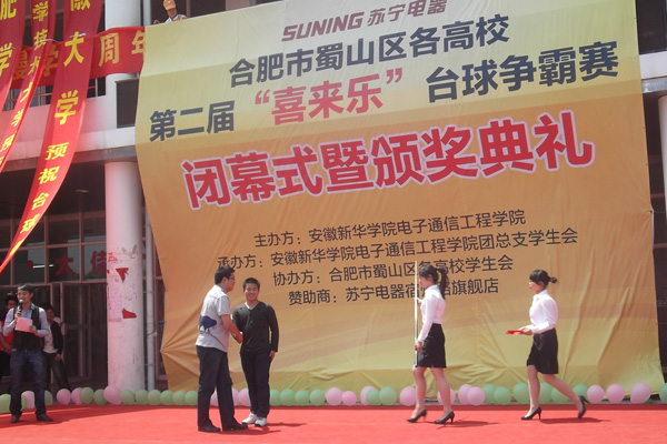 此次台球争霸赛得到了中国科技大学、安徽大学、安徽农业大学、合肥学院、公安职业技术学院、安徽经济管理学院、安徽林业学院等七所高校学生会的大力支持。经过三天激烈的角逐,我院获得前八名中的5个名次,我院的姚莹摘得桂冠,碰子瑶获得第二,合肥工业大学的宣健获得第三名。