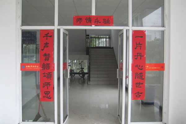 教师节前夕,各班级、学生会及助理团等早早地做好了准备,要给老师们一个意外的惊喜。助理团的同学早早在教学楼门上贴了一副对联以表达自己对老师的敬爱之情。他们还派专人代表学院向每位老师赠送了金嗓子喉片,并细心地贴上了自己的祝福卡片。学生会的同学们给老师们送上了一个小蛋糕,祝愿老师节日快乐,永远年轻。