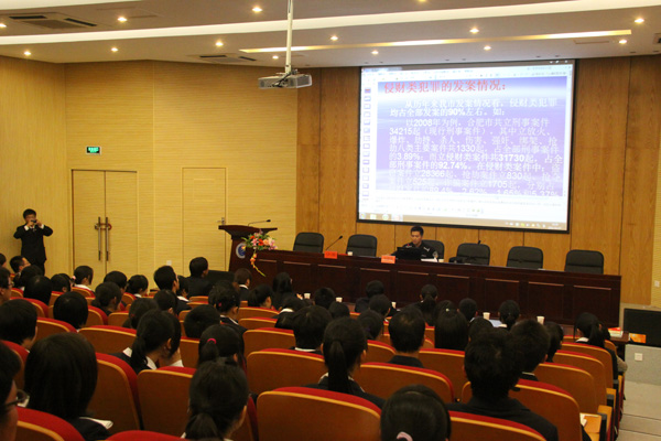 余警官从一个小寓言说起,从防抢、防盗、防骗、防交通事故四个方面讲授了四类案件的常见特点和预防措施。他大量运用了发生在我们日常生活中的实例,并结合大学生的具体情况,细致分析了各类案件中常见的犯罪手段,引导同学们如何在生活中提高自身的防范意识、增强自我保护意识。同时,对以上四类案件在合肥地区的常见特点,有针对性的教给大家一些安全防范措施,以及遇到紧急情况下的处理办法,并总结了一些小口诀,便于大家记住。他说,大学校园并非与世隔绝的“世外桃源”,相反,由于大学生缺乏社会经验,恰恰容易成为各类犯罪分子的目标。同学们只有加强自我防范技能,提高应对突发事件能力,学会运用法律武器保护自己的合法权益,不断增强法制意识、维权意识和自我保护意识,才能更有效地防止受到犯罪分子的威胁和伤害,保护自己的人身财产安全。余警官的讲座语言诙谐幽默,内容系统全面,具有很强的针对性和实用性,同学们听得非常投入,现场时时爆发出一阵阵热烈的掌声。