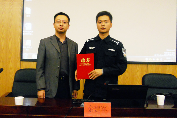 随后,计勇聘请余警官担任药学院“校外安全辅导员”,并向余警官颁发了聘书。