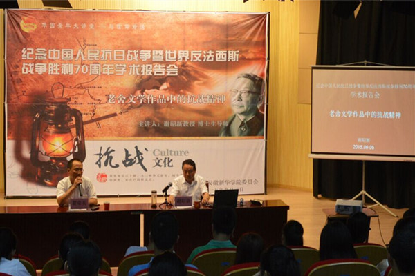 本网讯(通讯员:马兰)为纪念中国人民抗日战争暨世界反法西斯战争胜利70周年,9月2日下午,文传学院与校团委在文化与新闻传播学院演播厅,共同举办了一场《老舍文学作品中的抗战精神》专题报告会。报告会由文化与新闻传播学院顾问谢昭新教授主讲,学校两百多名师生参加了报告会。