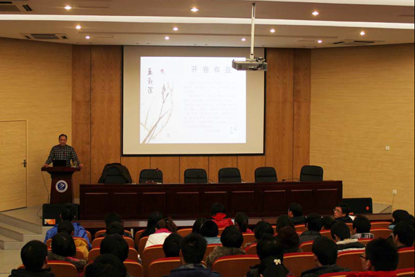讲座之前孙家启向同学们介绍了此次报告会的背景和内容,随后姚根友院长以宋太宗的日阅《太平御览》三卷为开篇题,介绍了自己遇书、好书、爱书,从而养成赖书的好习惯,引出了开卷有益的好处,提醒同学们要珍惜现有的宝贵时间,以学习为主,增加自己的阅历。