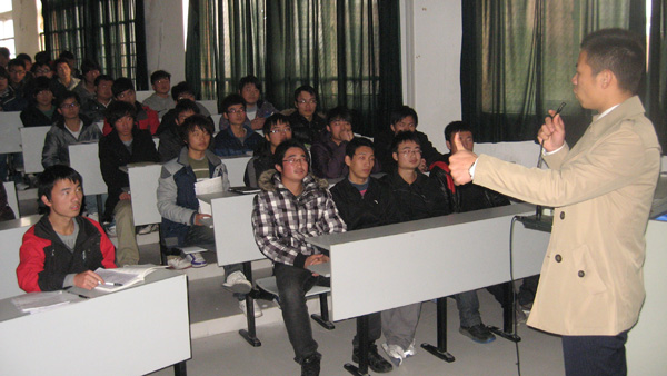 12月14日下午,电子楼414教室气氛热烈,电子通信工程学院2008级优秀毕业生周金虎正在为2011级新生作就业指导报告。