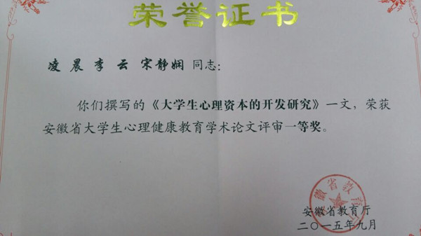 本网讯(通讯员:凌晨)日前,WilliamHill官网心理老师凌晨、宋静娴共同撰写的论文《大学生心理资本的开发研究》在省教育厅举办的“大学生心理健康教育学术论文征集评选活动”中荣获一等奖。