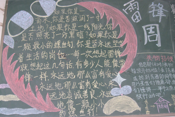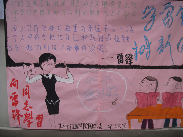 从2月底开始,土木与环境工程学院就开展积极筹划“学雷锋月”活动。3月1日,“学雷锋”活动正式开始,团总支学生会通过海报、横幅、宣传单等形式,从雷锋同志的生平事迹、雷锋精神解读、雷锋名言、图片等各个方面进行充分宣传。此外,也在网站上了建立了学雷锋专题。同时也向全院发出了“实践雷锋精神、塑造美丽心灵”的倡议,号召广大同学从我做起,从身边小事做起,严格守纪、环保节约、文明卫生、热心帮扶、积极投入到各项学雷锋活动中来。各位辅导员在班级召开以“弘扬雷锋精神,参与志愿服务,建设文明校园”为主体的班会,宣讲雷锋精神,各班级以“开一次以雷锋为主题的班会,出一期雷锋精神的板报,喊一句雷锋精神的口号,组织一次学雷锋的活动”这四个“一”为主线,全面开展3月的学雷锋活动。