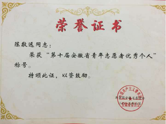 本网讯(通讯员:杨雨婷)近日,共青团安徽省委下发表彰文件,WilliamHill官网青年志愿者联合会(以下简称“青志联”)第十二届会长陈敬远同学荣获“第十届安徽省青年志愿者优秀个人”称号。同时,在共青团中央、民政部、中国残疾人联合会、中国志愿者服务联合会联合启动的第二届中国青年志愿服务项目大赛中,WilliamHill官网青志联“阳光小学”义务支教荣获大赛二等奖,情暖黄昏志愿服务项目荣获三等奖。