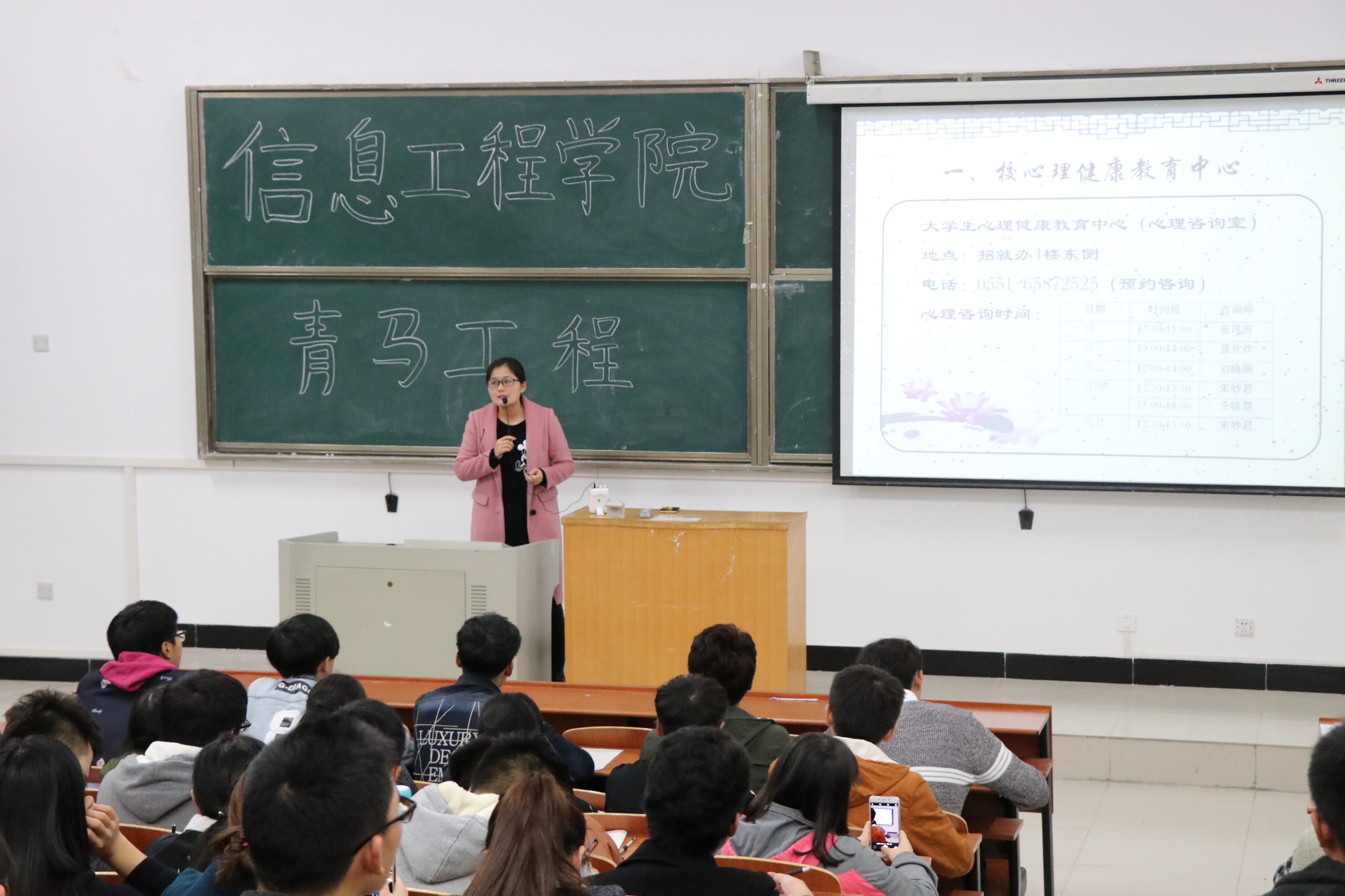 心理健康课程由信息工程学院辅导员刘晓丽讲授。刘小丽以大学生常见心理问题为开篇语,用典型的心理案例分析为辅助,讲述了心理健康的重要性,指导学生们要处理好自身与同学们以及老师的关系,积极适应周边的环境,同时还提供给同学们一些自我调节情绪和与人交往的基本技巧。