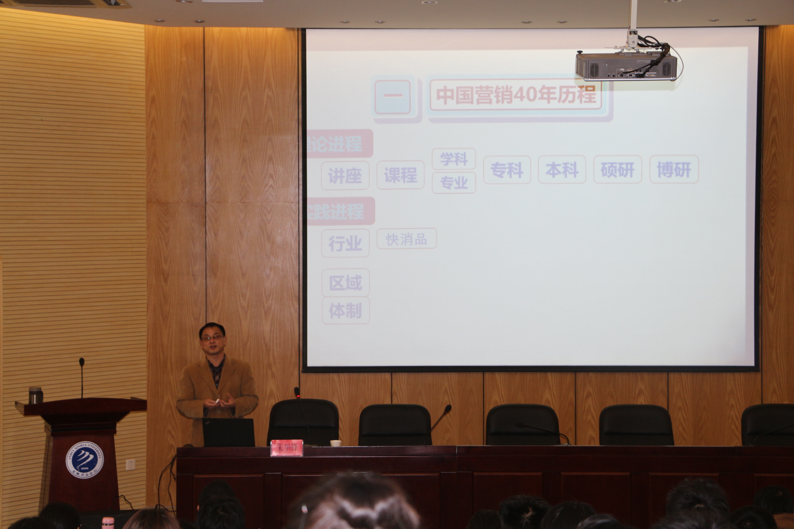 朱华锋是市场营销省级专业带头人,营销理论与营销实战两栖专家,曾获得全国优秀中青年教师、全省模范教师,省级教学名师等荣誉称号,在市场营销教学和实践上具备丰富的经验。讲座中,朱华锋首先介绍了中国营销和安徽营销发展的40年历程,随后他结合热点案例分析了2010年到2015年间互联网对我国营销的影响。最后他指出,在互联网时代进行品牌建设,坚守与创新是双核引擎,贯彻产品思维,回归产品质量,回归客户价值,找回客户满意,是营销的当务之急。