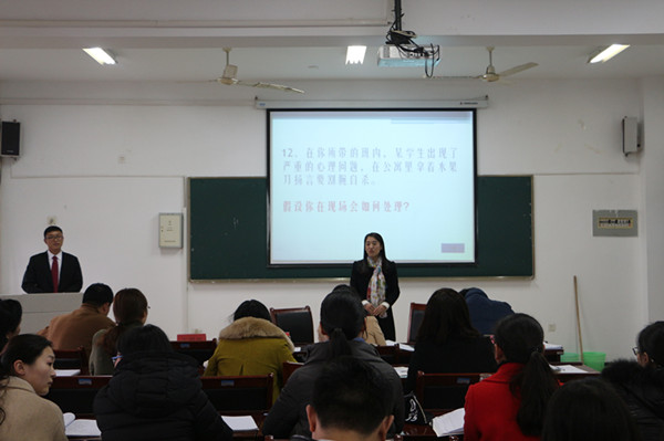 为增强辅导员的职业化技能,更好地做好学生的教育工作,12月13日下午,商学院开展第五届辅导员技能大赛,专兼职辅导员悉数参加,比赛以“情境案例分析”的方式开展,学生真实再现日常工作、生活和学习中遇到的心理问题、职业生涯规划、恋爱情感问题、校园网贷、人际关系问题等情景,辅导员与之“面对面”交流的形式开展,着重考察辅导员解决问题的实战能力。