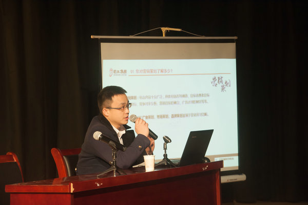 徐涛从当年对专业学习的态度出发,结合自己五年的工作经验和所取得的成绩,分别从什么是餐饮营销、怎样写有趣的餐饮文案,以及当下最流行和实用的营销技巧等几个方面作了精彩的报告。在近三个小时的报告中,徐涛还和在校的广告学专业学生们进行了互动,系统地解析了营销策划的具体工作流程,解答了学弟学妹们在学习广告学专业过程中的困惑。