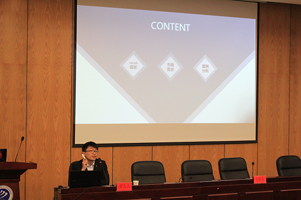 王庆从“VR是什么”入手,向听众介绍了其历史发展的四个阶段及VR技术的多感知性、存在感、交互性、自主性四大特征;他对动态环境建模技术、立体显示和传感器技术、系统开发工具应用技术、实时三维图形生成技术这几个VR的核心技术进行了详细阐述,其间还穿插了华为、HTC、中金公司、淘宝网对于VR技术的应用实例,就VR的市场前景和应用范围举行了展望。最后,王庆就VR设计人才知识结构要素以及大学生如何紧跟技术前沿等问题与现场师生进行了互动。