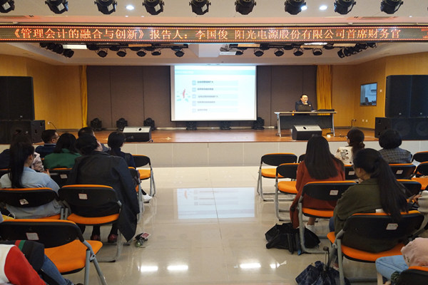 本网讯(通讯员:项燕)10月11日下午,财会与金融学院在小礼堂举办“管理会计的融合与创新”主题学术讲座。本次讲座特邀财政部会计准则委员会咨询委员、安徽省总会计师协会管理会计专家委员会主任、阳光电源股份有限公司首席财务官李国俊博士主讲。讲座由财会与金融学院执行院长操宏华主持,财会与金融学院全体教职工及部分学生代表近300余人聆听了讲座。