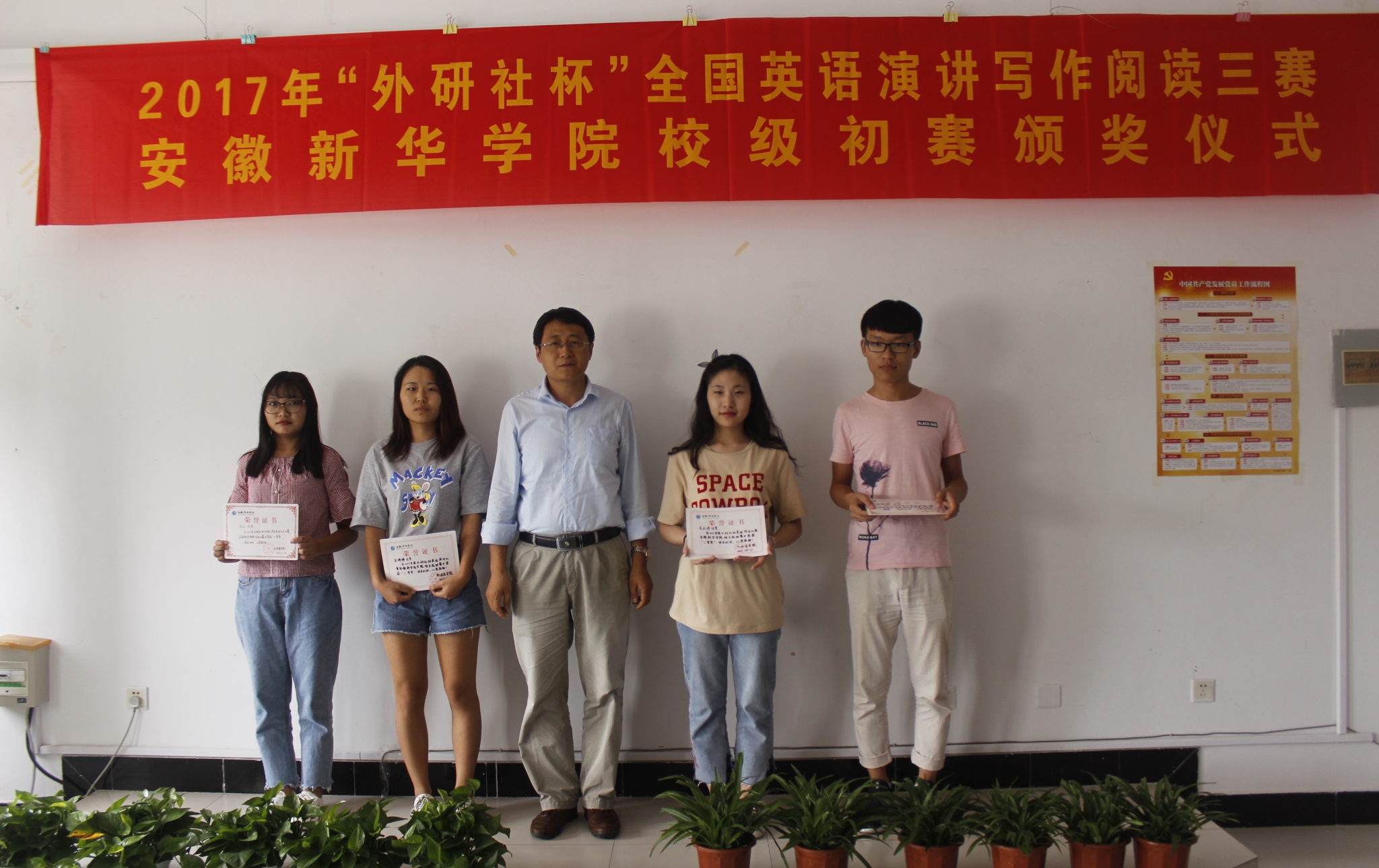 随后,吴晓群宣读表彰决定。此次获奖学生共25人,其中,英语演讲比赛获奖9人,英语写作比赛获奖8人,英语阅读比赛获奖8人。外国语学院领导依次为获奖选手颁奖。
