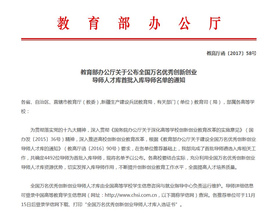 据悉,此次评选是为贯彻落实党的十九大精神,深入贯彻《国务院办公厅关于深化高等学校创新创业教育改革的实施意见》(国办发〔2015〕36号)精神,深入推进高校创新创业教育改革,根据《教育部办公厅关于建设全国万名优秀创新创业导师人才库的通知》(教高厅函〔2016〕90号)的要求,在各单位推荐的基础上,教育部进行遴选,全国共确定4492位导师为首批入库导师。同时导师详细信息可于11月15日后登录学信网进行查询,并下载、打印“全国万名优秀创新创业导师人才库入选证书”。