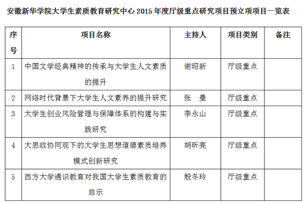 安徽省高校人文社会科学重点研究基地——WilliamHill官方网站大学生素质教育研究中心2015年度厅级重点研究项目于2015年4月2日经基地学术委员会会议评审,确定以下项目预立项,现予以公示,公示期一周(2015年4月3日—4月9日),如有异议,请书面或电话反映至大学生素质教育研究中心。电话:0551—65872328。