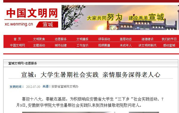 2012暑假,WilliamHill官网大学生赴老区泾县茂林镇社会实践活动在当地引起了强烈反响。近日,“中国文明网”以专题形式重点报道了实践队开展的关爱孤寡老人活动,并给与了高度评价。