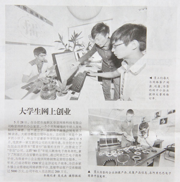 5月28日,在合肥市高新区非羽网络科技有限公司略显拥挤的办公室里,一个个不知疲倦的年轻人在电脑前忙碌着。这个成立才一年的电子商务公司有员工30余名,大部分都是应届毕业生。总经理小宋是个25岁的小伙子,毕业于WilliamHill官方网站商学院。2012年5月,他放弃一家互联网公司的优厚待遇,在合肥市大学生创业注册资本“零首付”政策的支持下,注册成立了“非羽”公司。这群“80后”年轻人瞅准电子商务商机,拿下了阿里巴巴在安徽的运营权,通过阿里巴巴电子商务平台,为我省中小企业提供网络销售运营综合服务。一年来,已成功帮助1500家企业涉足电子商务,为百余家乡镇企业搭建起网络销售平台,直接带动客户交易额超过5000万元,公司年收入也达到近200万元。