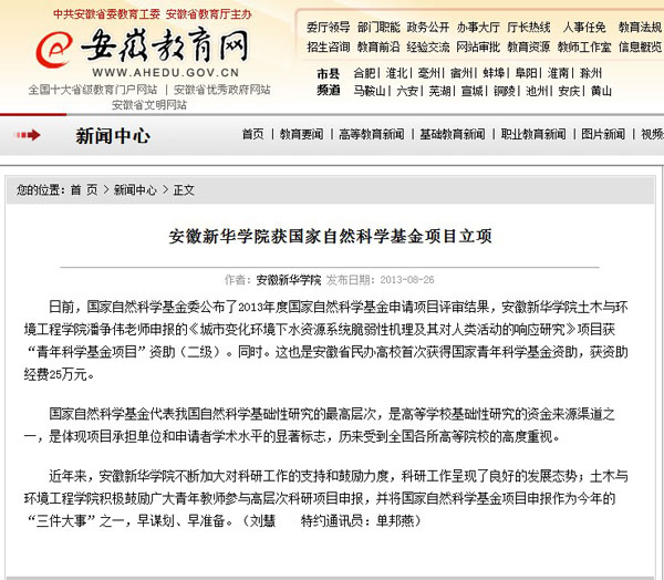 安徽教育网:WilliamHill官方网站获国家自然科学基金项目立项