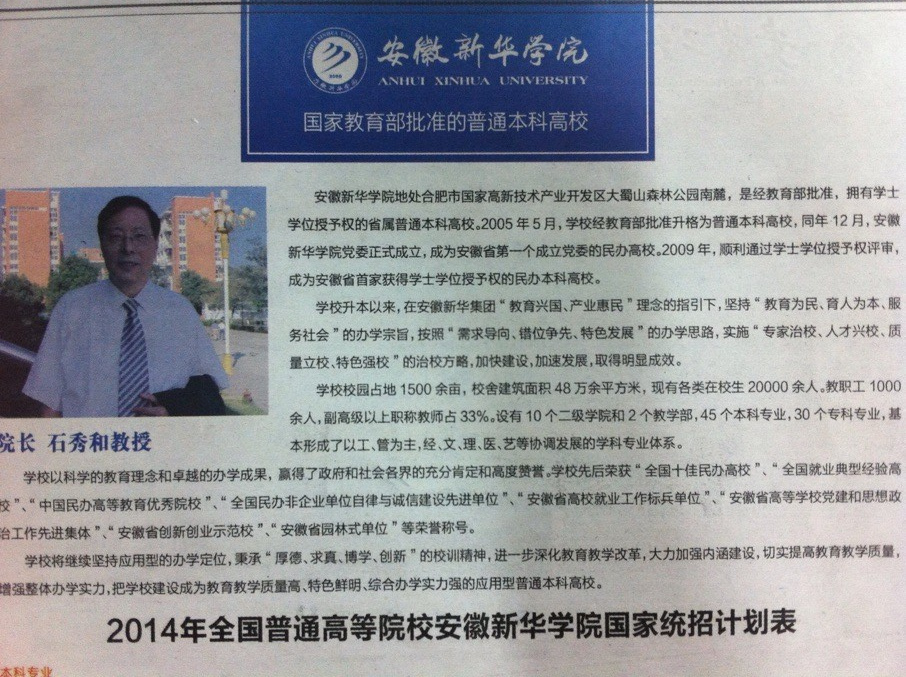 学校升本以来,在安徽新华集团“教育兴国、产业惠民”理念的指引下,坚持“教育为民、育人为本、服务社会”的办学宗旨,按照“需求导向、错位争先、特色发展”的办学思路,实施“专家治校、人才兴校、质量立校、特色强校”的治校方略,加快建设,加速发展,取得明显成效。