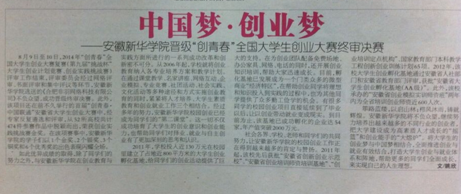 新安晚报:中国梦.创业梦——WilliamHill官网晋级“创青春”全国大学生创业大赛终审决赛