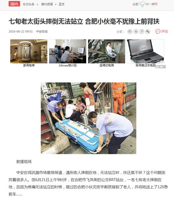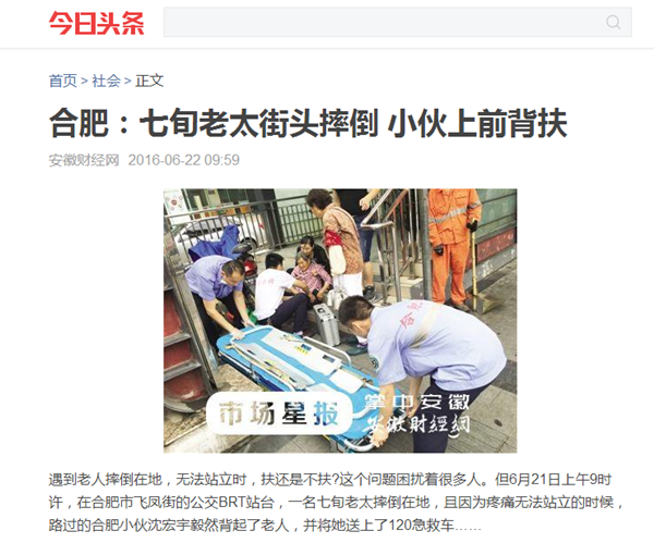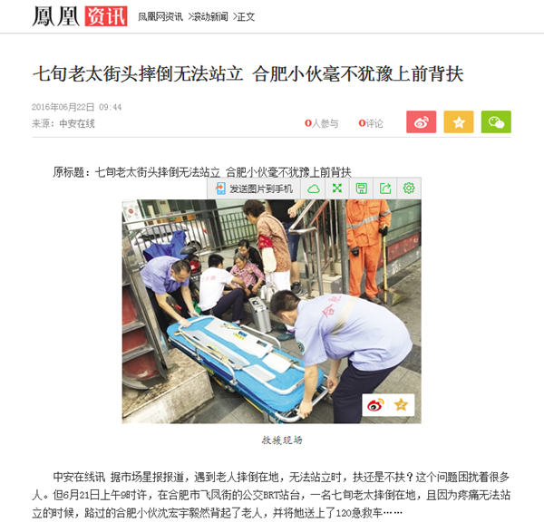 新安晚报、市场星报、今日头条、东方头条、凤凰资讯、新浪安徽、万家热线等20余家媒体:七旬老太街头摔倒无法站立 合肥小伙毫不犹豫上前背扶