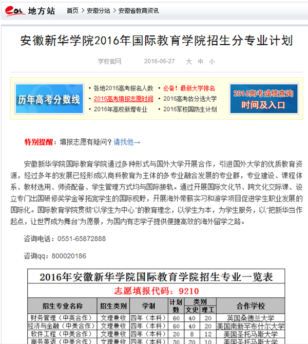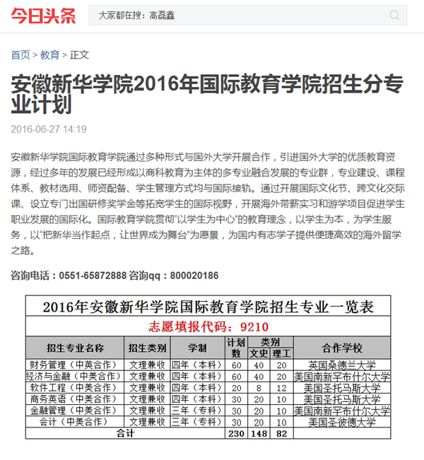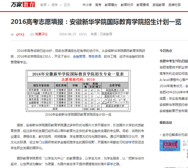 中国教育在线、今日头条、万家热线:WilliamHill官方网站2016年国际教育学院招生分专业计划