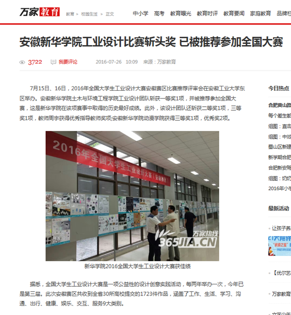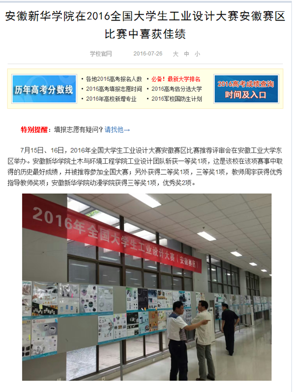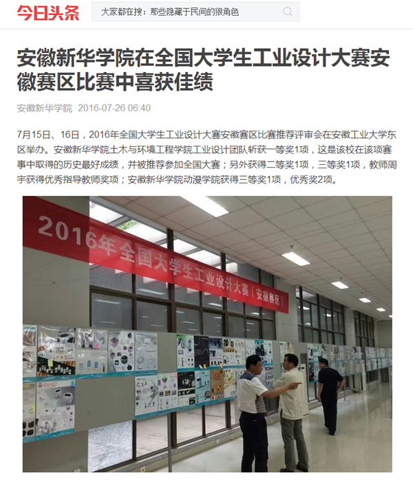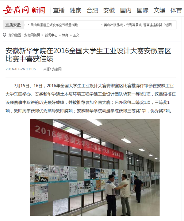 中国教育在线、今日头条、安徽网、万家热线、UC头条、新安晚报微博:WilliamHill官方网站在2016全国大学生工业设计大赛安徽赛区比赛中喜获佳绩