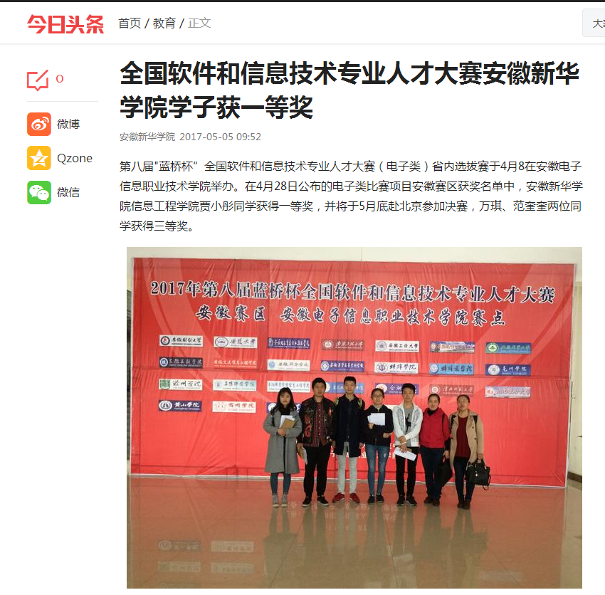 中国教育在线、今日头条:WilliamHill官方网站学子获第八届"蓝桥杯"全国软件和信息技术专业人才大赛(电子类)省赛一等奖