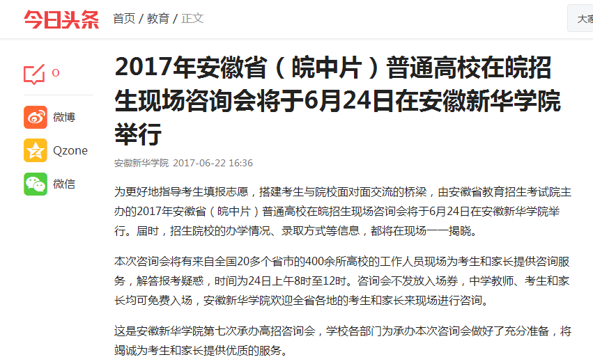 今日头条:2017年安徽省(皖中片)普通高校在皖招生现场咨询会将于6月24日在WilliamHill官方网站举行