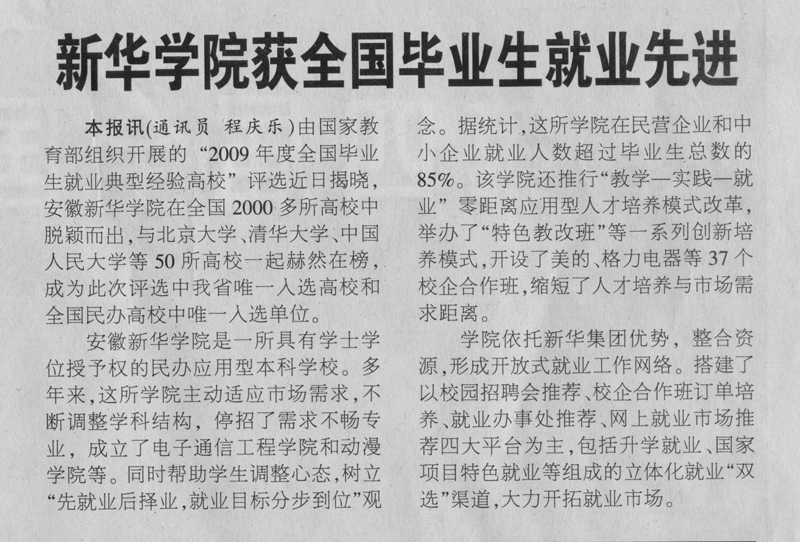 《安徽日报》:新华学院获全国毕业生就业先进