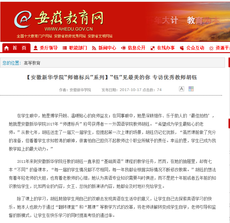 安徽教育网:【WilliamHill官方网站“师德标兵”系列】“钰”见最美的你 专访优秀教师胡钰